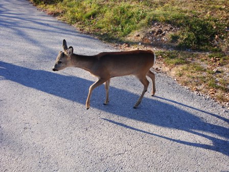 Potem pa pridem dol do ceste in tam... zgleda sem že zmatran in začenjam delat neumnosti. Najprej grem po cesti - kakor je tudi prav - a me kmalu prešine, da sem že predaleč (pa nisem bil) in da bi moral it direktno dol. Zato tečem nazaj do poti in jo mahnem direktno dol čez cesto po neki majhni potki.