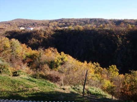 Škoda, ker nisva slikala, ampak tale kanjon je res kanjon, ej. Šele na drugi strani sva slikala nazaj, takole je zgledalo - in zagledala sva ga šele zadnji trenutek! Tamle nekje pri tistih hišah sva pogledala v globino dol...