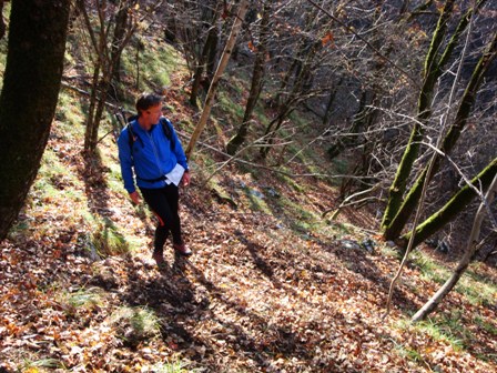 Ojej, v dveh minutah sem že dihal kot konj, ne zaradi zmatranosti, bolj zaradi koncentracije. Potka je namreč ozka, ponekod jo je dovolj le za eno nogo, polna listja, gnilega lesa in blata. Mokro. Spolzko. In predvsem strmo ko hudir. Pravzaprav kar prepadno.