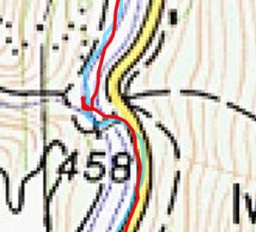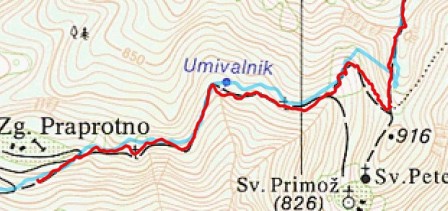 Testiranje GPSja je bilo kar ok, telefon je bil seveda v v nahrbtniku, Garmin pa na roki - tako pa to zgleda potem na karti - modra je Android in Galaxyjev GPS, rdeča pa Garmin FR305 GPS: