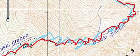 Se pa v Dolskem grabnu izkaže Garmin, ki je resnično dober sprejemnik. Android mu komaj sledi, sprejem je v teh ozkih grabnih pač malce omejen. Pa tokrat telefon niti ni v nahrbtniku, imam ga v žepu, enkrat mi je prej crknil in ga zdaj nadzorujem. Pa se kar drži.