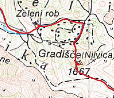 Šel sem se pofočkat čisto na vrh Gradišča, je preveč pihalo - na vrhu vedno piha -, da bi sploh obstal, nato pa sem jo raje zavil malce naokrog. Na vrhu je bilo namreč vse nekam prav na tanko zaledenelo in po tisti strmini od Gradišča do Zelenega roba se res nisem hotel dričat. Saj je treba malo hišice spoznat, morda spet kdaj prav pride!