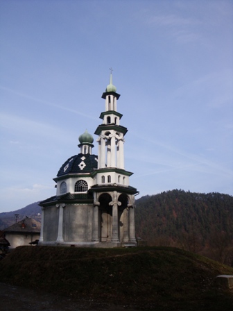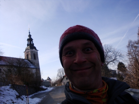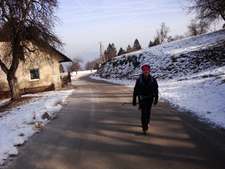 In ker je bilo pasje mraz, sem jo potegnil naprej (črna pika pred cerkvijo), ostala dva pohodnika pa sta se kar nekaj obirala in se pustila bičati tistemu zoprnemu vetru... Brrrr.