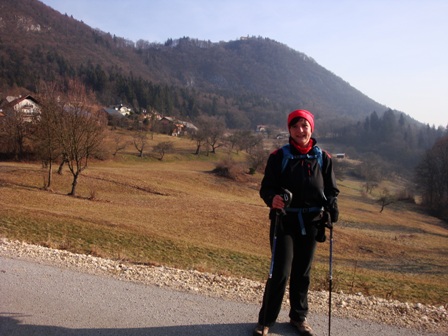 Murovica, Cicelj, Miklavž, tisti prelepi del E6 do Velike vasi, potem pa hitro po cesti v dolino. Občudujeva naš greben s povsem druge strani, kar nekako čuden se zdi, tisti Miklavž pa stoji tam daleč, visoko, visoko! In Cicelj ima kar neke stene, huh, s te strani vse drugače zgleda!