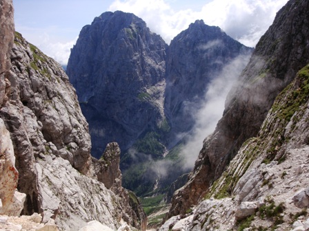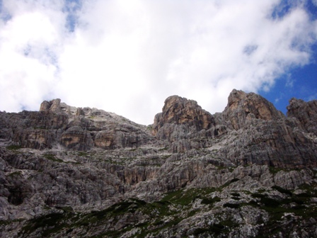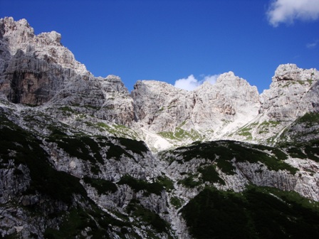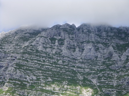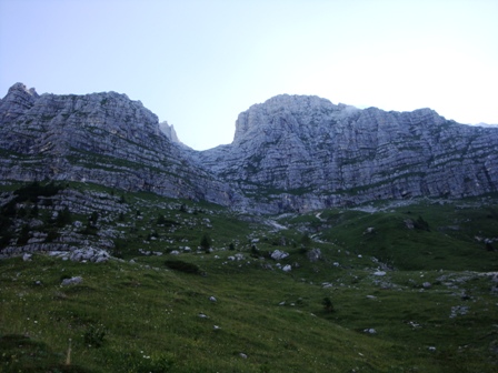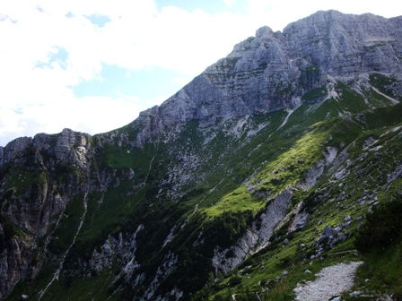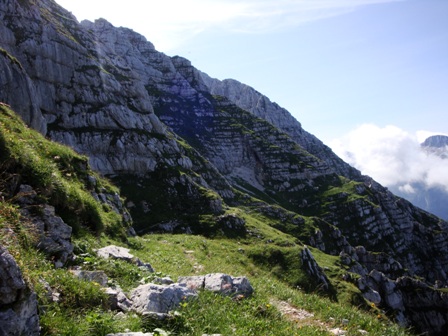 Passo degli Scalini pa ni prav daleč, za njim pa Sella Nevea. Tukajle za nadaljevanje uzrem strme trave in greben, po katerem bi morala iti jutri. Se že začenja kaj kopičiti?