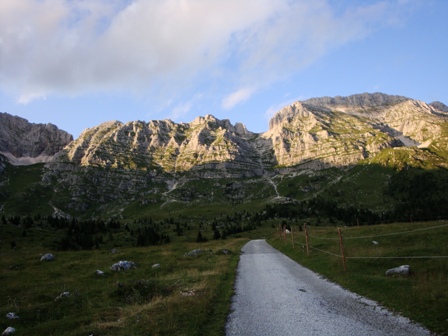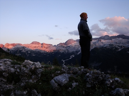 Sva se zato zjutraj kar malce preveč obirala. Je bilo treba še dol na Pecol v avto po vse stvari. Sonce pa se je že sprehajalo okrog vrhov.
