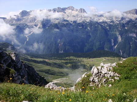 in potem še izpred koče Brazza na hribe na drugi strani: