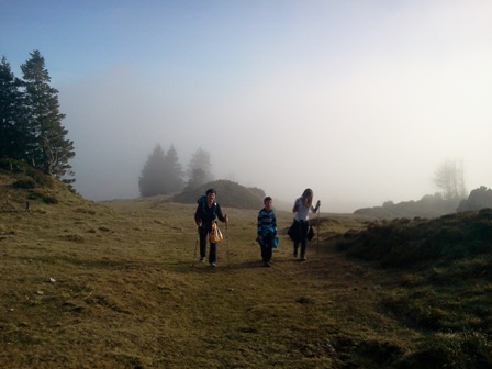 Zanimivo, kako prav nihče ni niti opazil, da je kar nekaj danes prehodil. Vse je bilo tako umirjeno, počasi, od postojanke do postojanke, od malice do malice, od megle do sončka in nazaj v meglo. Da sta prišla čisto iz doline na Veliko planino pa sploh nista pogruntala do večera. Juhej!