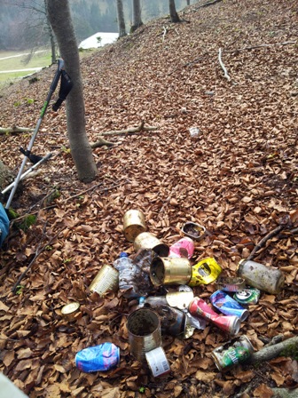 Od kje smeti, nam ni jasno, od zgoraj niso, ker so preveč na kupu, od nekje blizu so prišle. Najbrž od bližnje koče, potem pa kaka žival odnese vrečo za vogal, je že moralo v njej kaj dišat!