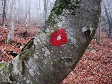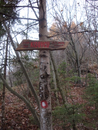 Tudi tu je vse oblačno, megla je le malce nad nami. Gremo gor, gremo pozdravit na Kisovec! Po lovski poti, ki sicer ne bi smela biti markirana, a je vseeno opremljena s kažipoti.