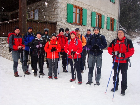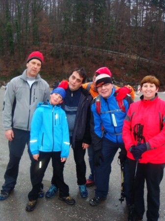 Snežilo je čisto do spodaj, meni so derezice prav dobro prišle! Spust je bil tokrat kar po markirani poti do Golic, nato pa po cesti do Zg. Tuhinja. Še eno skupinsko za dober konec, vsi zadovoljni!