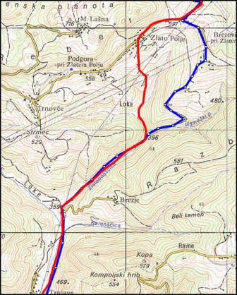 Zato smo našo pot vseskozi sproti prilagajali. Modra pot na karti je Načrtovana pot, rdeča pa dejansko prehojena. Na karti je naprimer prav lepo narisan kolovoz ob Zlatopoljščici