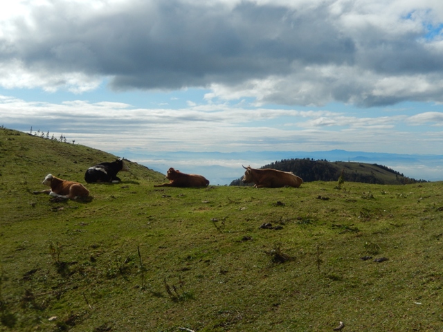 Na Planini Koren naju presenetijo krave. Ni to malce pozno? Seveda se takrat, konec septembra, ne zavedava, da bo še lep, prelep oktober in da krave že vedo... Njim se ni nič mudilo dol.