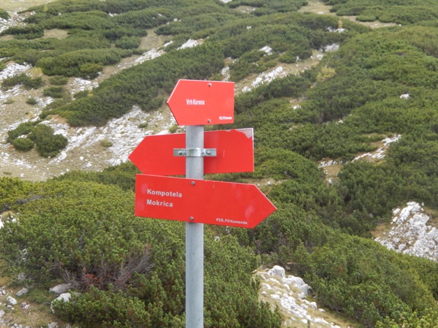 Vseeno se odločiva - pojdiva še naprej, proti Vrhu Korena. Še k sreči, da se malo spoznava in da prideva s prave strani. Upam, da ne bo kdo v megli verjel tejle tabli. Res bi bilo lepo od PD Komenda, da bi tole napako popravili... (Dve tabli, tista v levo in tista v desno sta enaki in kažeta proti Kompoteli in Mokrici. Ena gor, druga dol. Zanimivo, kajne?)