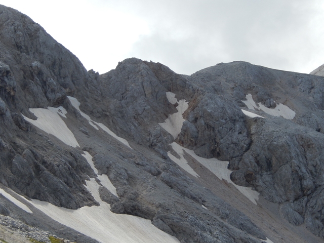 Ta, že takrat zaprta pot, gre točno po polovici slike - le, da je bilo takrat mnogo več snega. Vse zbito in ledeno, vsak korak si nama zbijal s kamnom na tistih dveh presneto strmih snežiščih. Jaz pa sem Ti do popolnosti zaupal in Ti sledil. Pravzaprav točno tako, kot si Ti meni zaupal, da se bom v tistih malih stopinjah obdržal in mi pozornost - mlademu fantu - ne bo popustila.