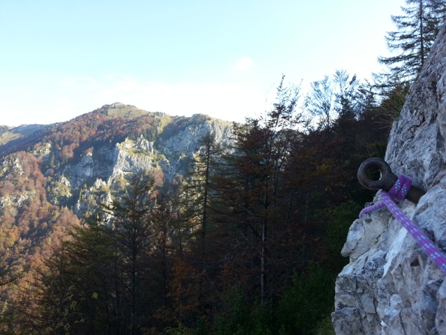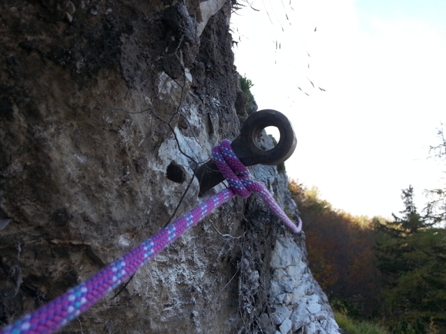 Človek mora dobro pogledat, da vidi tamle našpikano steno in zajlo nad klini. Spodaj je pa kar precej lufta, ni prav nedolžno, ni pa tudi nič hujšega (trdim zdaj, v varnem zavetju pisarne).