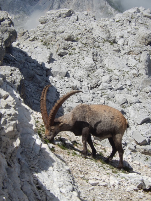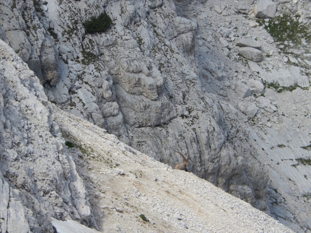 Šele potem, ko mu skoraj skočim na roge in mu moram prav reči: "šu, šu", se le umakne tistih deset metrov gor v skale, da greva lahko mimo. In naju pri tem prav čukasto gleda, da kar malo pospešiva korak mimo njega.