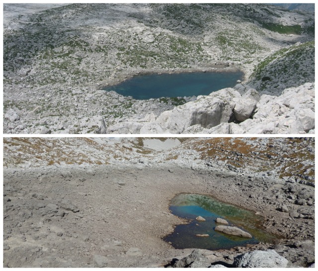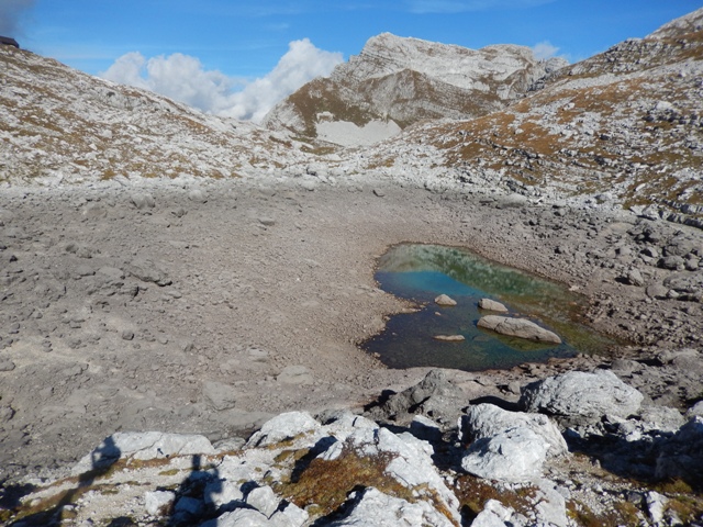 Jezerca tam na Prehodavcih so tokrat, konec oktobra, precej majhna, skoraj nič vode. Rjavo jezero je le še mala lužica.