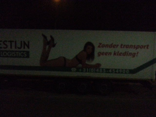 Kje sva torej? Aha, spet iščeva plac za spat. Zopet sva pogumna in zavijeva z avtoceste in seveda spet najdeva en dober plac ob neki večji firmi. Jasno je, da nisva sama, tu je že kar nekaj tovornjakov! Na hitro prestaviva še prikolico z reklamo (zaznamek: ročno je treba spustit, potem gre lažje, čurimuri!) in sva parkirana. Malce bolj zoprno je le lulat, ko so pa povsod kamere.