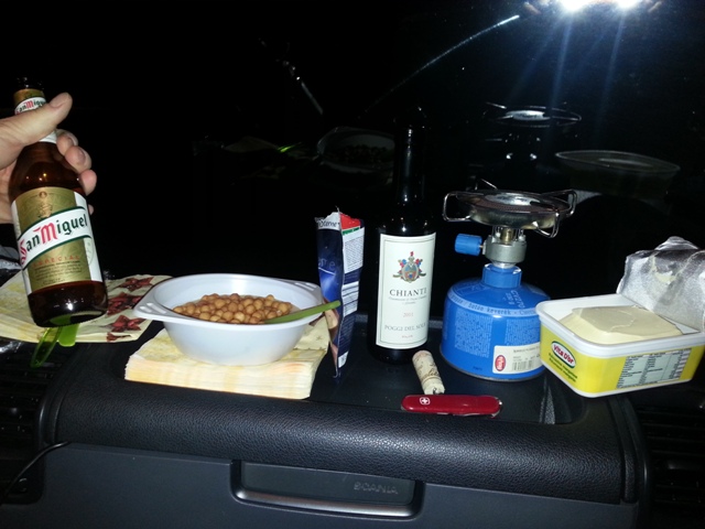 A ponoči vseeno ne delajo, čas za razkladanje imava zjutraj, tako ali tako je pa treba imet počitek, zato se porazdelimo po ne tako velikem parkirišču. Tokrat je treba še pazit, da nismo parkirani kabina ob kabini, ker se seveda vsem kar naprej vklapljajo hladilniki. In ti niso prav nič milozvočni. Fantje na vse pazijo!