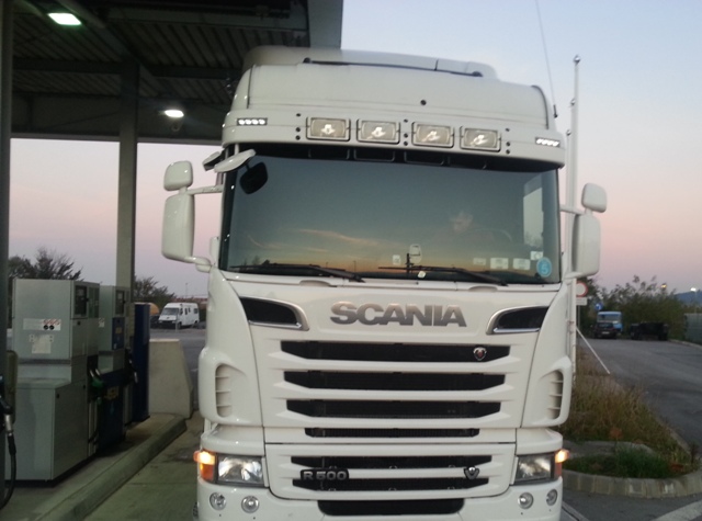 Scania, najin skoraj celotedenski dom! Urejena po Markovih željah, lepo, a nič načičkano. za kar sem mu hvaležen. Po celem tednu bi s kakšnim super svetlečim se znakom za svojim hrbtom še dolga leta mežikal Scanio. Osvetlitev tovornjakov je lahko velika strast, to se hitro vidi na cesti...