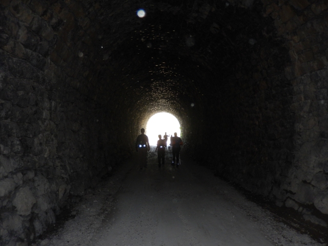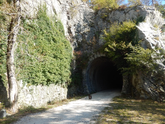 Kratek, a strm vzpon nas hitro pripelje do prvega predora! Trasa železnice Kozina - Trst je prvovrstna zabava za kolesarje in pohodnike.