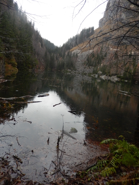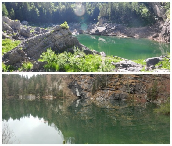 In kljub strmim in od spodaj navidezno neprehodnim stenam sva kar hitro na vrhu stene, kjer opazim tloris nekih ruševin, najbrž stara gozdarska vlečnica, nato pa sva že pri Črnem jezeru!
