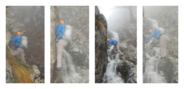Slapišče pa kar ne odneha, voda se spušča prav z vrha. Velikokrat postavava in občudujeva igro narave. Nekje v nekem vodniku piše, da moraš višje že kar dobro prisluhnit, da sem in tja slišiš šumenje Savice. No, danes si moraš prav dobro zatisnit ušesa, da NE slišiš šumenja vseh Savic, ki se zgrinjajo okoli tebe. Zanimivo.