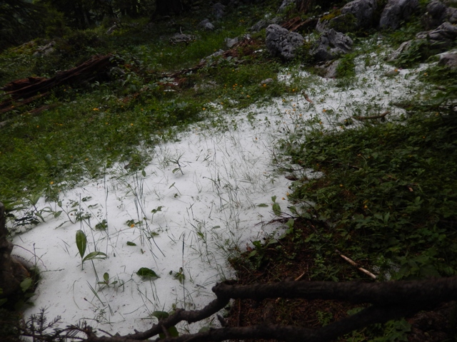 Uau, tule pa je bilo mraz, sva se pridušala, a kasneje izvedela, da je bila vsa ta sodra še od prejšnjega dne! Še dobro! Je pa bil to zelo nazoren dokaz, kako hitro jo lahko skupiš, tudi konec (vročega) junija, v (samo) sredogorju! Brez kape in rokavic nikamor!