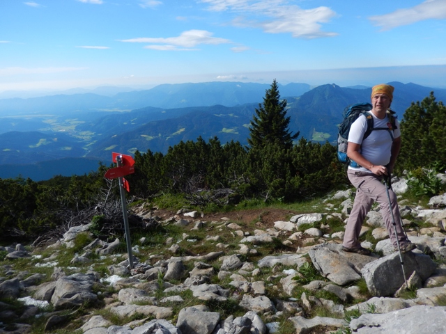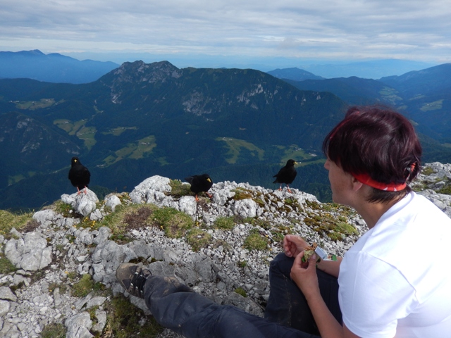 Na Raduhi še nisva bila, tudi zato sva se malo dlje zadržala, vsrkavala sva nove in nove poglede. Ojstrica s te strani je čisto drugačna, Obir, Olševa, Peca, Uršlja gora, Smrekovško pogorje, Golte. Čisto nov pogled! Grohata oz. Grohota - kakor se pač odločiš, na kateri strani boš, sploh nikoli še nisva videla, oz. sva najbrž ga, ko sva bila na Olševi, a se ga nisva zavedala!
