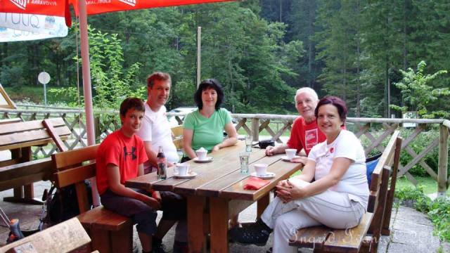 Smo hoteli začet hoditi vsaj pred osmo, da nas ne bo sonce prekmalu lovilo, a vse ne gre tako enostavno! Parkiramo, se oblečemo, navlečemo težke nahrbtnike in se odpravimo. A takoj za vogalom, čaki... a ni tole Mladen? Pa glej, gor kavo pije Ingrid! Ha!