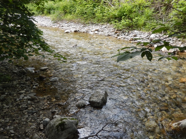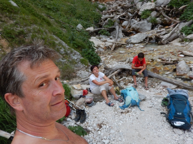 Pot je lepa, a strma. Vmes pa je polno nekih stvari, ki te motijo in ne moreš prav hitro hodit. Naprimer tolmunčki, ki se jih trudiš spit do konca. Še vedno je namreč vroče ko pri norcih, od nas le teče in škropi...