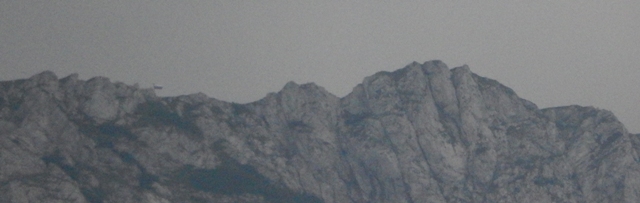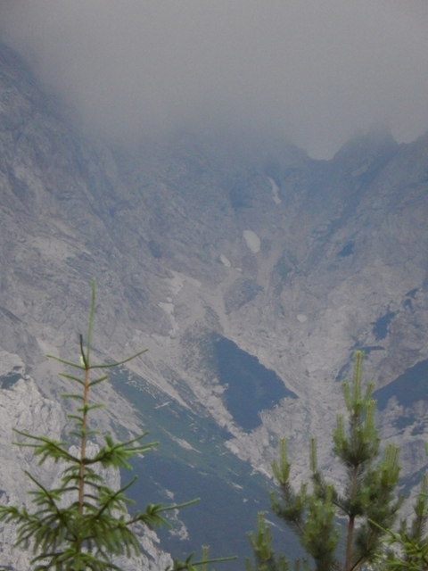 In tudi Kamniško sedlo je je vedno bolj zavijalo v oblake. Šele doma sem potem opazil zastavo na vrhu Sedla, sploh nisem vedel, da se vidi od tule...