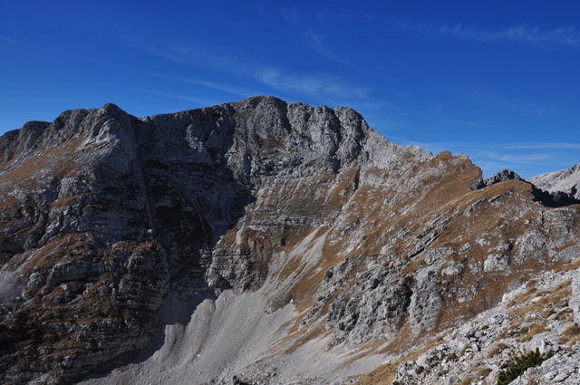 Višje kot si, več se odpira. Mali Draški vrh, Srenjski preval in desno Viševnik. Boj med soncem in senco. Hm, tamle nekje vmes jo mahnemo dol?