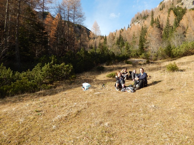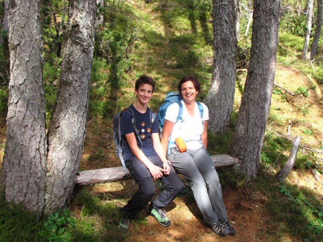 Pot navzdol gre kar hitro in pri Konjščici smo prehitro. Dajmo malo počit, se malo usest, malo počakat. Nekaj motovilimo z macesni in primerjamo Kamniške z Julijskimi.