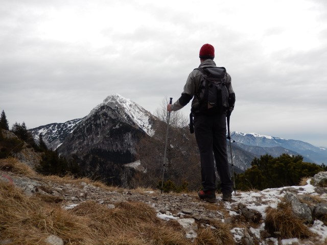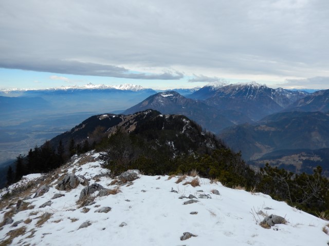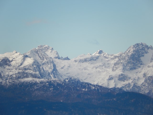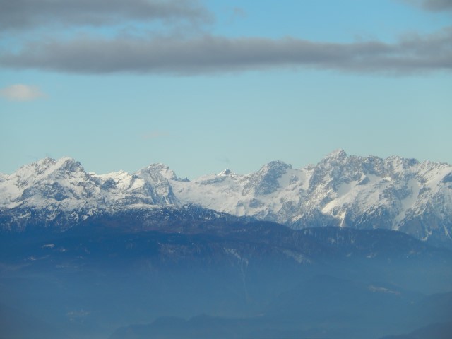 Jaz pa sem seveda občudoval Julijsko verigo, ki je v takih razmerah prav enkratna. Edino takole, v takih sneženih, jasnih dneh lahko vidiš katere gore se skrivajo v tej liniji. Poleti je vse veliko bolj mrčasto in pojma nimaš kaj je spredaj, kaj zadaj in kaj vmes. Rjavina, Vrbanove, Cmir, Stenar, Razor vse je na kupu, vse zgleda ena linija pa je vmes kar nekaj dolin.