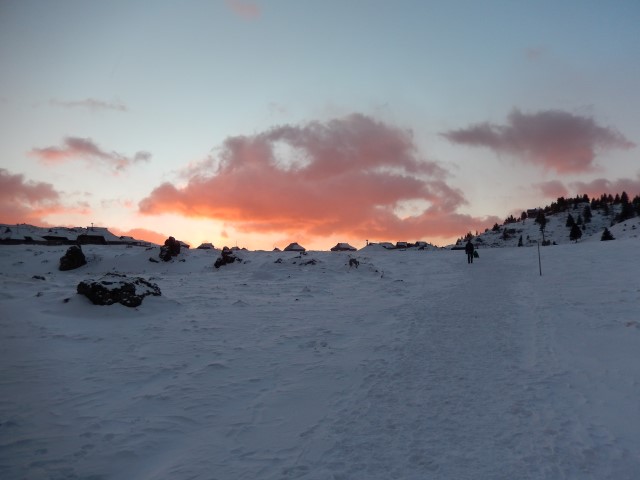Ne, nič se nam več ne mudi. Občudujemo večerne barve, klepetamo in čakamo, kdaj bo tema. Ali pa vsaj Jarški dom za prvi počitek.