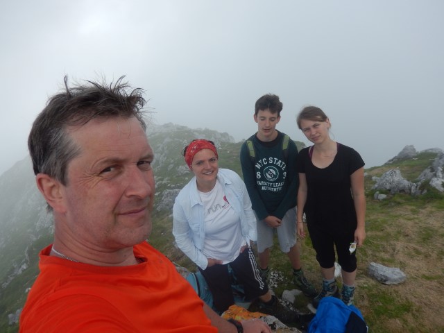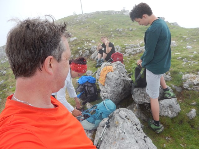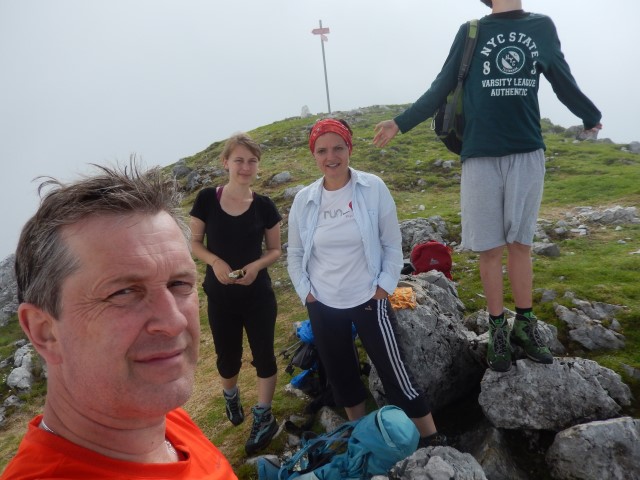 Z vsakim metrom je ljudi vse več, že na vrhu jih je bilo kar nekaj, nato pa se vse samo še gosti. Kljub temu, da je na vrhu megla, a vseeno se vsake toliko časa razjasni. Mi pa kar malo pihamo - a ko smo pa mi gor, je pa samo megla, a?!