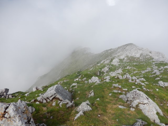No, izkazalo se je, da smo hodili ravno kake pol ure preveč - vreme se je že kisalo in Veliki vrh je že dobil svojo kapo. Pa tudi če je ne bi - so jo tudi že vsi ostali vrhovi okoli njega in na kakšne razglede ni bilo več za računat!