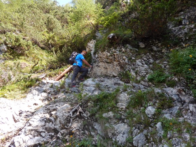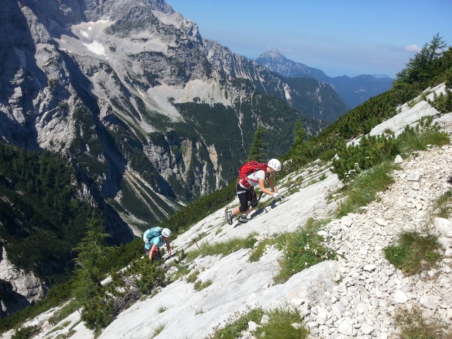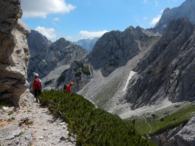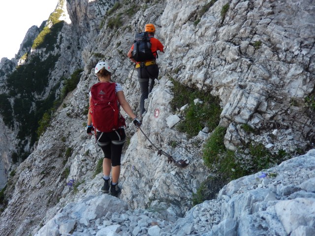 Potem pa smo spet navesili nase vso opremo (ki smo jo prej po Slovenski dali dol) in se zapodili v prečenje sten Ledinskega vrha. Precej objektivno nevarna pot zapadlemu kamenju. Itak je vse razbito, povsod sam grušč. Drugače pa super speljano, nikjer kakšnih hudih prepadov, čeprav se ti prej zdi, da bo to težko.