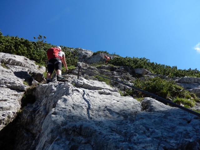 Kakorkoli obrneš je precej strma, žica je sicer dobro napeta, ne veš pa prav dobro, kje bi hodil. Levo, desno, ob, nad, včasih imaš zajlo tudi vmes. Varovanje ti pa včasih tudi narobe hodi. In potem se toliko ukvarjaš sam s sabo, da si hitro gor.
