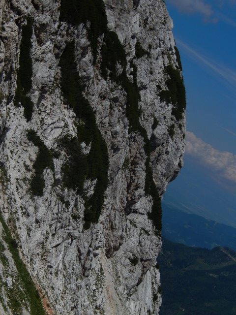 Ampak vstop v ferato sem pa le našel. Seveda doma, ob dobri povečavi, se tamle spodaj nekje vidijo zajle čez gladke plošče. No, tule pa skoraj gotovo ne bom šel, a obljubil pa le ne bom... Pa slika je postrani slikana, saj je strmo, ne pa toliko!