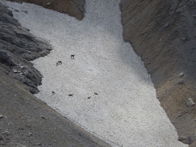 Ljudi je bil cel kup, zgoraj, dol, v steni, pod steno, skratka vikend je bil enkraten, ljudi polno, a se gamsi (gamsi!) niso prav nič sekirali in so bili tokrat celo z družinami toliko pogumni, da niso pobegnili že ob prvem človeku. Tako pa smo lahko opazovali mladino, ki se na snegu ni obnašala prav nič drugače kot človeška mladina. Gor, dol, levo, desno, v par minutah opazovanja se ti je že kar rolalo v glavi, toliko so mladički preskakali. In ko jim je bilo vroče, so lepo pritisnili trebuščke na sneg.