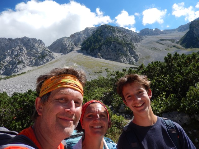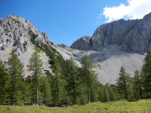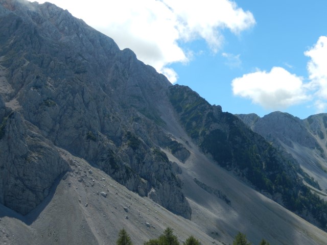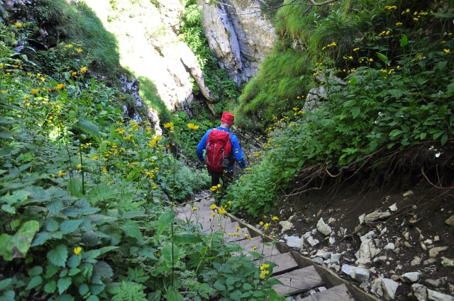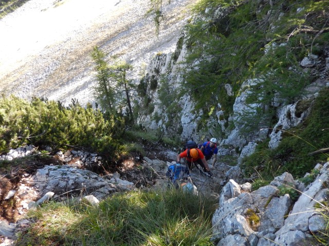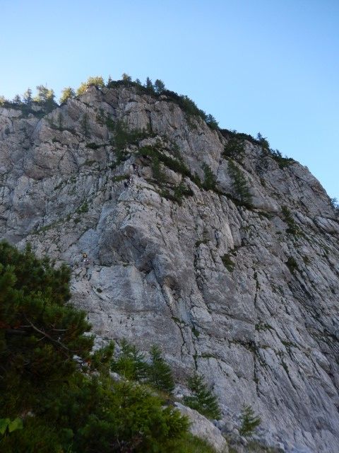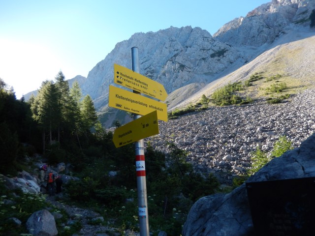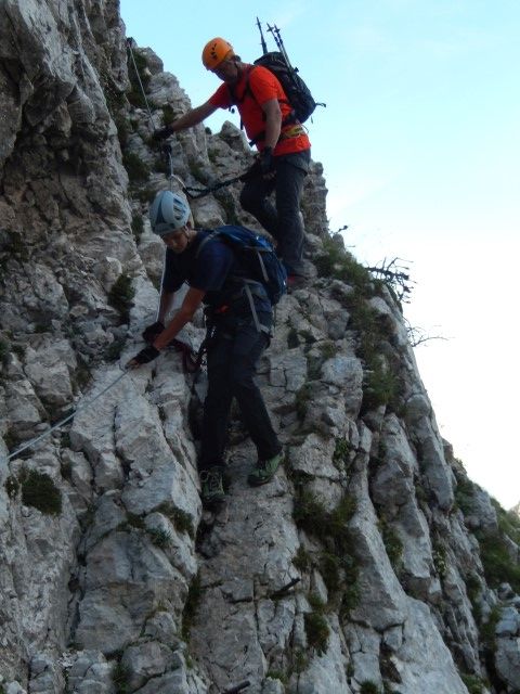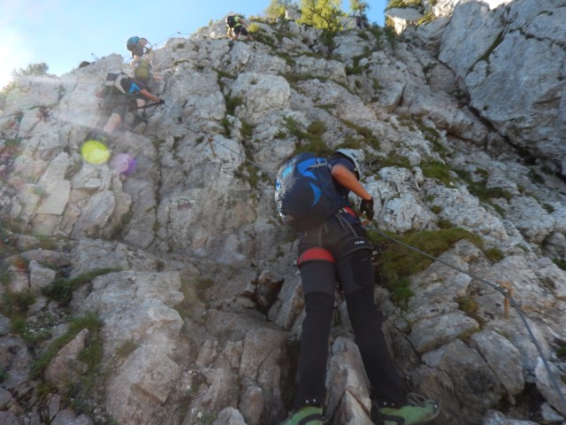 Pred nekaj leti je staro pot v začetku nekoliko podrlo, zato so avstrijci začetek prestavili nižje in speljali pot direktno gor v stilu ferate. Pa pejmo direkt čez steno! No, malo me je to plašilo, priznam, nekateri so o teh začetnih metrih kar preveč pisali.