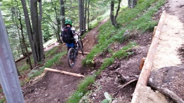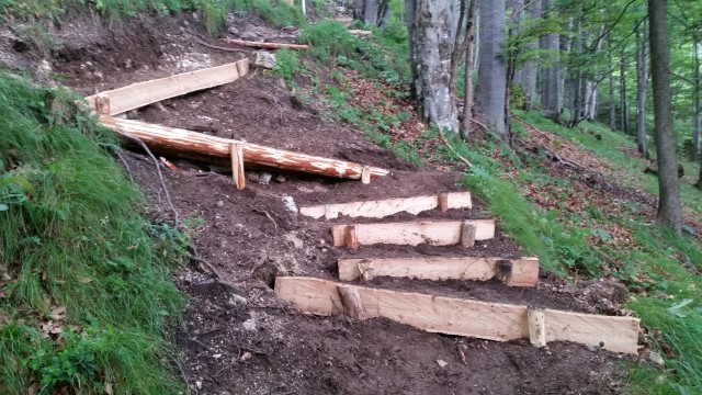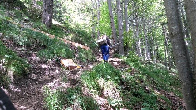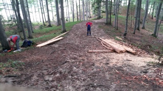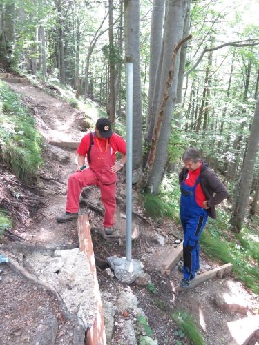 Povsem nepričakovano je tam nekje sredi dela na nas naletel tudi gorski kolesar! Kaj hujšega - markacisti ravno v delu na poti, z vsem orodjem v rokah, mimo njih pa gorski kolesar! Zaprepadenost obeh strani je bila velika in fant je v hipu premeteno pogruntal, da je zapeljal pravzaprav direktno v sršenje gnezdo. Kolo pod miško in še preden smo se lahko obrnili, je že skakal po stopnicah navzdol.