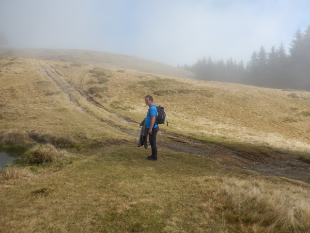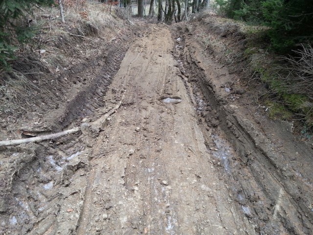 Odvažal je vse, kar je mojster malo višje nažagal. Žago sva seveda slišala, on pa naju ni, zato sva bila bolj previdna, pot sva v tisti količini blata že povsem izgubila, do gozdarja sva se pa prebila kar povprek, tako da sva do njega prišla v varnem kotu in ob pravem času - ko ni več žagal. Kakšno smo rekli, nekaj o zapuščenih poteh in o tem, da bo počakal par minut, preden bo spet kaj podrl.