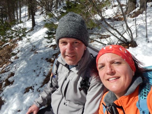 V dolini ni bilo skoraj nič snega, tako da o snegu spet nisva prav veliko razmišljala. Po pravilu: če ga spodaj ni, ga pa tudi zgoraj ne bo. No, sem in tja (velikokrat) se glede tega zelo motiva. K sreči teh neumnosti ne počneva v visokogorju. V predgorju pa vedno. Le zakaj?!