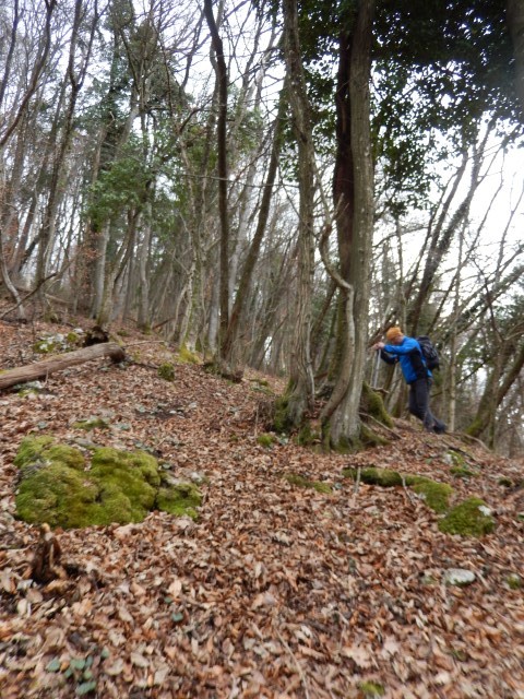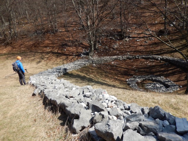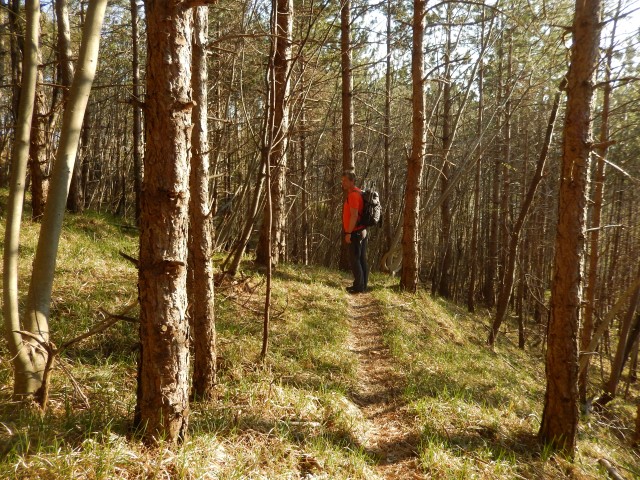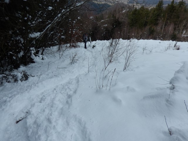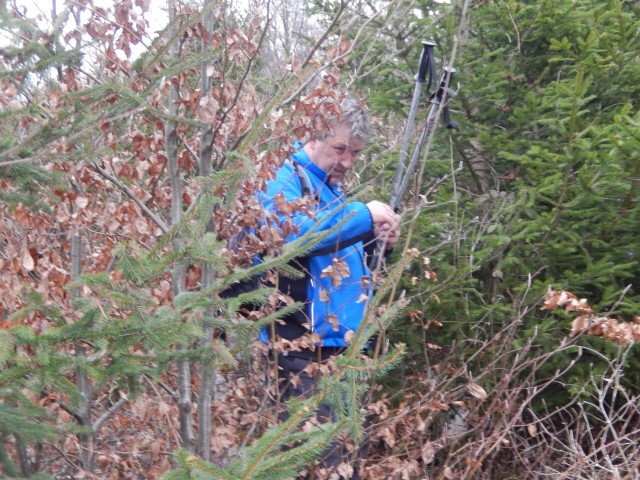 Nazaj jo tokrat ne ubereva po spodnji cesti, ampak jo mahneva spet kar lepo po grebenu. V začetku skušava mimo jevniške skrivnosti najti še staro pot, kar nama tudi uspe, vendar pa je že kar precej zaraščena. Tale ne bo več uporabna, aprila tule čez sploh ne bi več prišel...