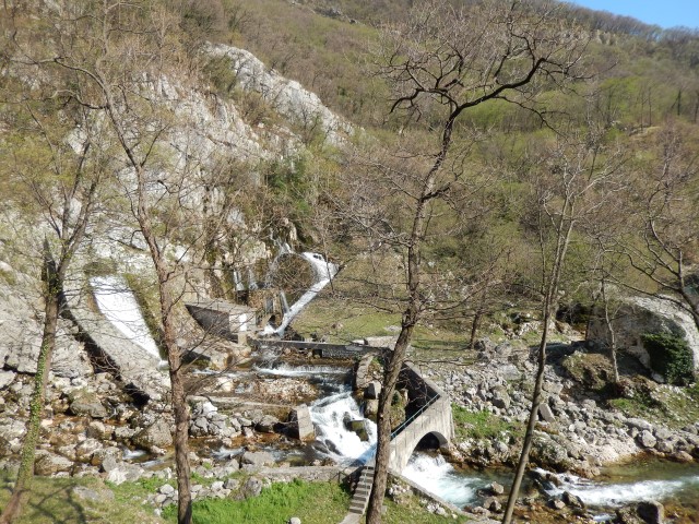Potem pa prideva do izvira Hublja, kjer noben od naju še ni bil. In bila sva prijetno presenečena, prelepo! Večkrat ga vidim na slikah, ko divja v povodnji, kot pa takole, umirjenega, pozidano obzidanega. Stene nad njim pa so tudi prav lepe, povsod okrog polno ljudi.