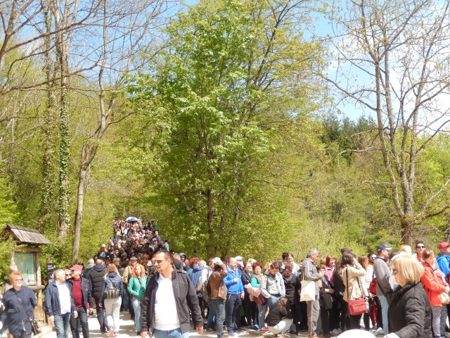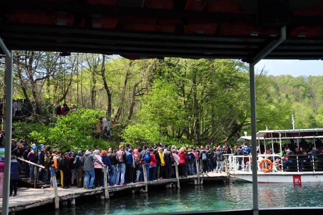 Vreme je tipično aprilsko, ko je sonce, je vroče, ko je senca, je hladno. In na jezeru piha, zato je Helena precej premražena. Uspe pa ji fotografirat vso to gnečo, ki čaka na ladjico v nasprotno smer. Ojej, še dobro, da smo bili zgodnji...